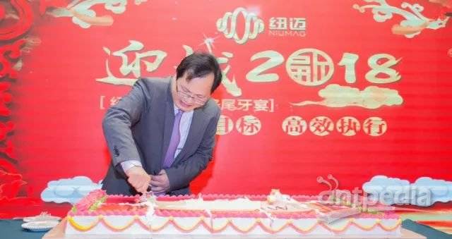 杨总现场切下2018年的业绩蛋糕,与现场每一位员工及嘉宾分享,象征2018目标分解,高效执行,圆满完成任务!
