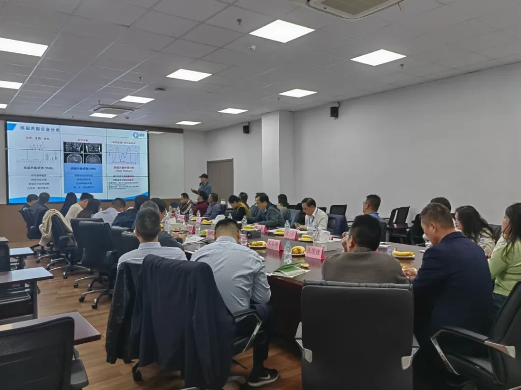 返回会议室后,产品部刘经理向与会的企业家们作了题为《低场核磁共振技术在材料领域的应用》的专题汇报。刘经理指出,低场核磁技术具备快速测量(单样仅需1–2分钟)、原位无损等核心优势,能够良好适配研发与质量管控等场景,有效弥补传统检测方法在效率方面的不足。目前,万象城平台已形成包括颗粒表面特性分析仪、核磁共振变温分析仪以及多通道全自动工业检测设备在内的系列化产品,满足了市场多样化的测试需求。