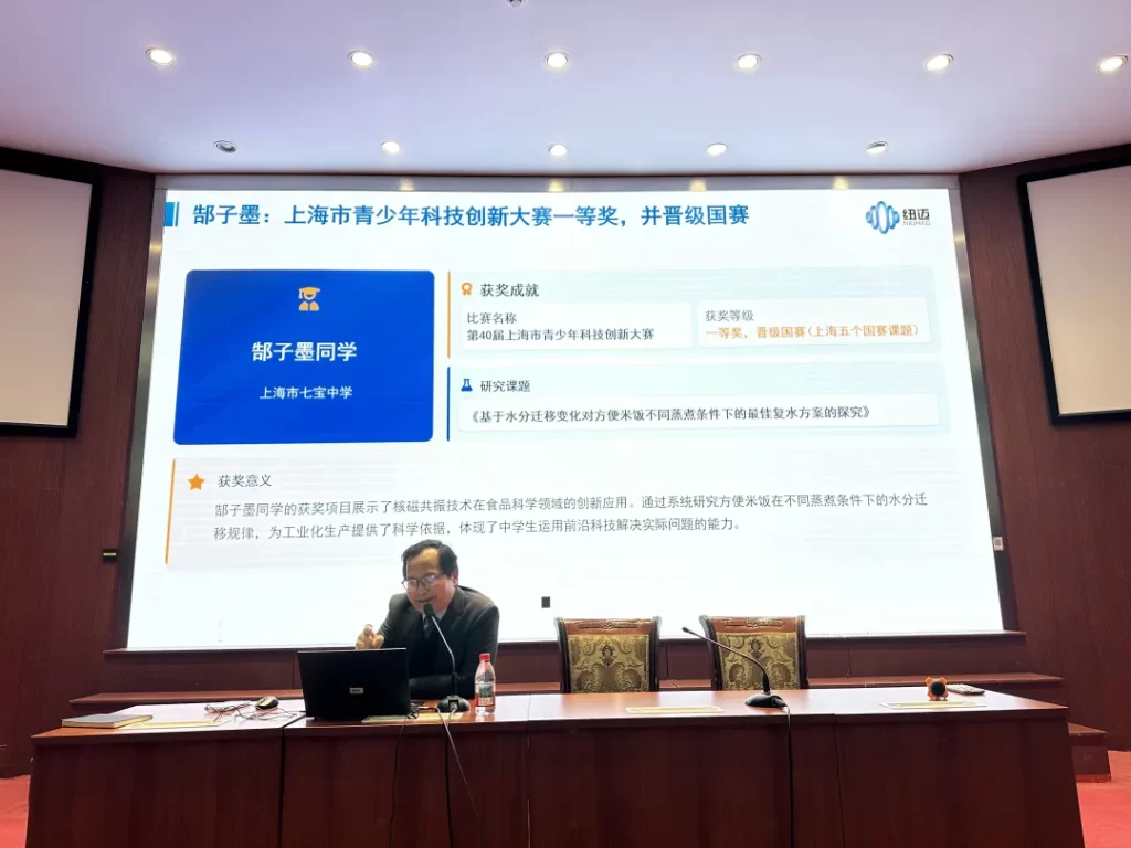 校企合作的科创成果,成为本次讲座的亮眼篇章。七宝中学与万象城平台深度携手,通过联合暑期科创项目、系统课程学习、创新实践平台搭建,让前沿核磁技术真正走进课堂、走近学子。吴赛娅同学凭借《反复冻融猪肉内部的水分变化迁移规律及其对口感的影响因素探究》斩获上海市 “明日科技之星” 一等奖,郜子墨同学的方便米饭复水方案研究晋级全国青少年创新大赛,七宝中学 2018 届校友邱月淇更是成为国际医学磁共振学会青年科学家奖首位中国获得者…… 一个个鲜活的科创案例,生动印证了产教融合培养创新人才的显著成效。