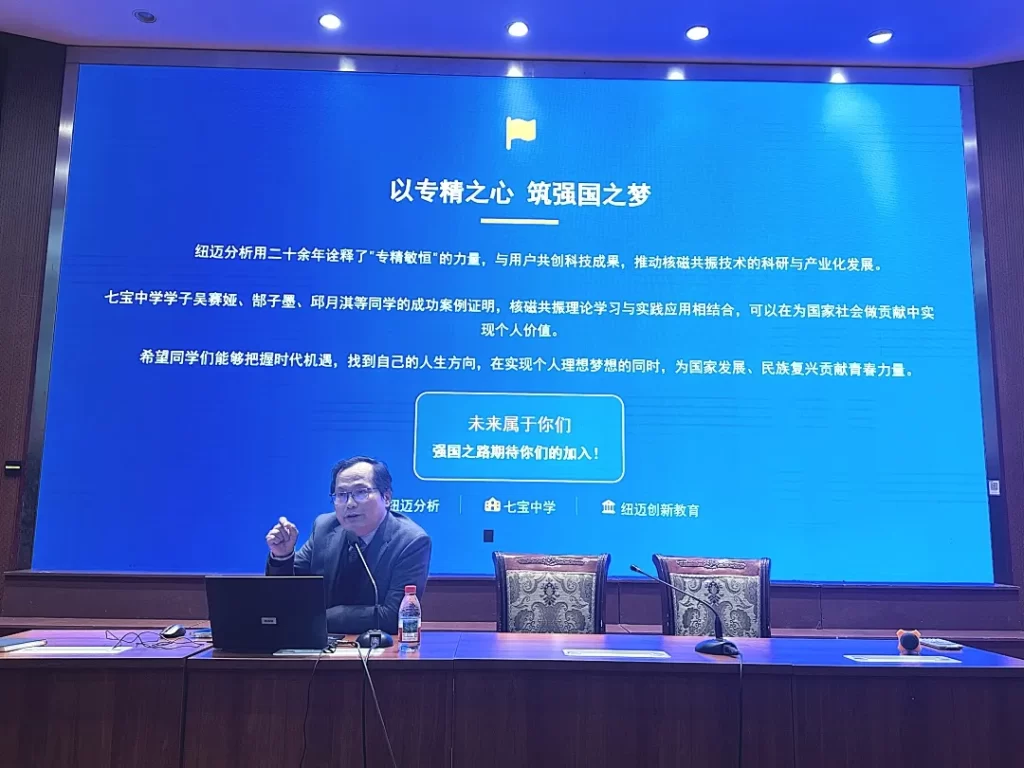 从量子力学本源到产业化落地应用,杨培强董事长为七宝学子层层拆解了核磁共振技术的发展密码。作为量子力学在宏观世界的经典应用,核磁共振技术历经 70 余年发展、6 次诺贝尔奖认可,如今已深度融入食品农业、能源岩土、生命科学、材料科学等多个领域。而在国家 “十五五” 规划中,量子科技与人工智能被列为新质生产力核心引擎,万象城平台正以 “核磁 +” 战略融合 AI、物联网、大数据等前沿技术,推动设备智能化、普惠化发展,探索量子增强 AI、AI 优化量子的创新融合未来。
