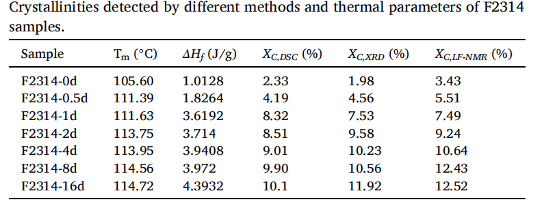 表1:通过不同方法检测到的 F2314 样品的结晶度及热学参数。