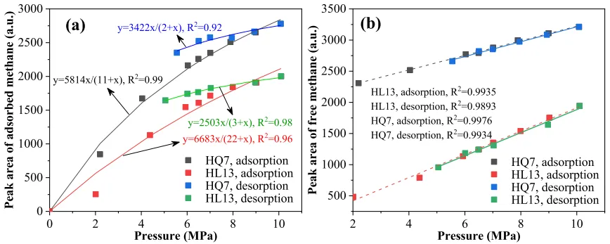 如图三所示吸附峰面积与甲烷平衡压力之间的关系。HL13和HQ7样品的吸附峰面积在10MPa时,初始平衡压力2MPa时的7.89倍和3.29倍。图三b中两个样品的P2峰拟合曲线几乎相同,表明自由甲烷在两种过程中都表现出接近可逆的行为。