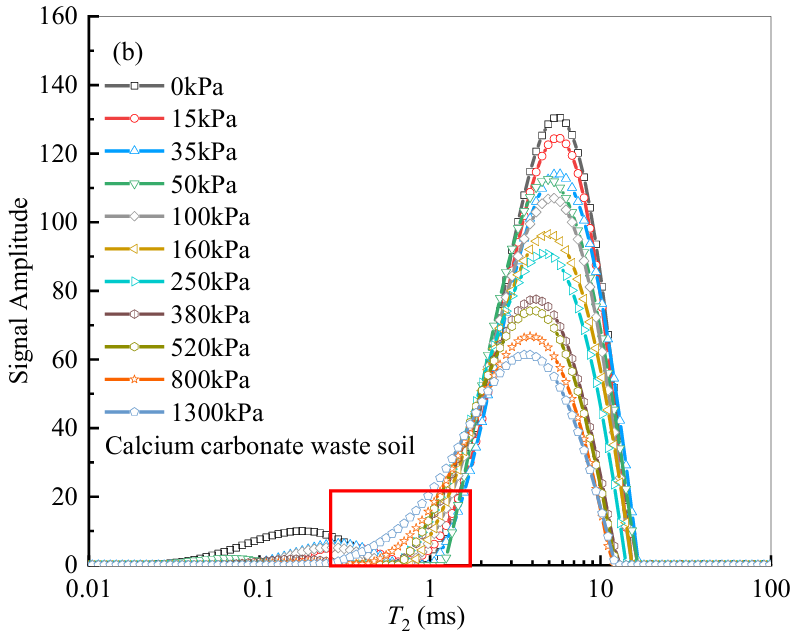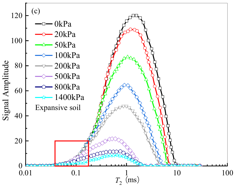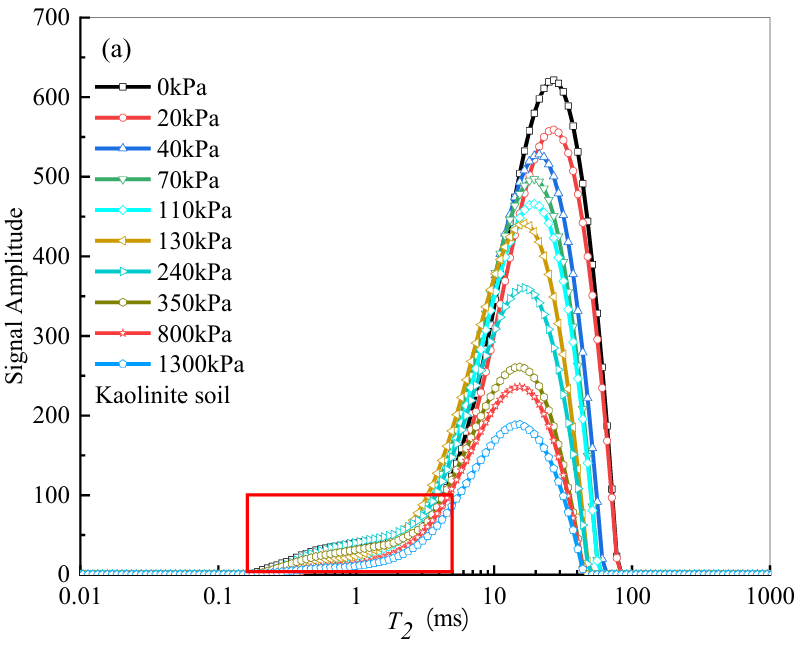 土壤间差异:不同土壤的T₂曲线变化特征存在差异,这主要归因于颗粒尺寸分布、初始含水量、干密度和矿物成分的不同所导致的孔隙结构多样性。例如,膨胀土的T₂值主要分布在0.04至10 ms之间,而高岭土的分布范围更宽0.1至85 ms。