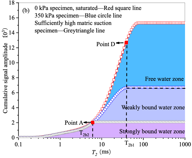 1)自由水:图中对比了饱和状态(0 kPa吸力)与临界基质吸力状态(例如高岭土为350 kPa)下的两条累积曲线。两条曲线之间的面积,代表了在吸力从0 kPa增加到临界值的过程中被排出的水分,这部分被定义为自由水。