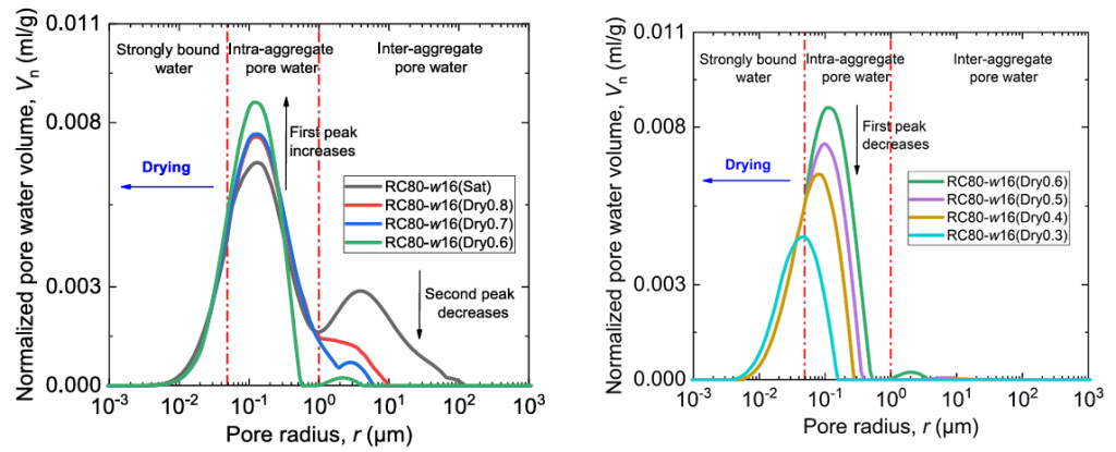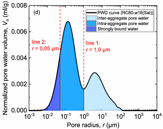 阶段2(图四b):随着干燥继续进行,曲线面积随饱和度降低而减小,表明土壤整体水量下降。在团聚体间孔隙水完全排出后,团聚体内孔隙水含量开始快速减少。同时,整个曲线向左移动,反映了土壤干燥过程中的收缩现象。