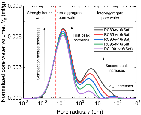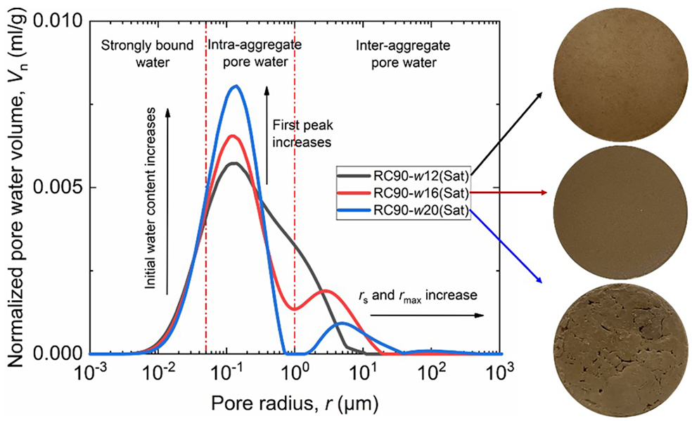 图三显示在较低的初始含水率下(w12),曲线呈单峰形态,表明土壤颗粒尚未充分聚集形成团聚体结构。当初始含水率增至(w16)和(w20)时,曲线转变为双峰形态,这标志着土壤颗粒已经聚集成团,形成了典型的“团聚体内孔隙”和“团聚体间孔隙”并存的二元结构。