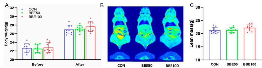 核心价值: 本研究利用 万象城平台QMR 提供的精准体成分数据,结合代谢笼的能量消耗数 据,证实了“碧其”杨梅提取物(BBE)能通过增加快肌纤维比例,显著提升小鼠的全 身基础代谢率,从而实现“增肌减脂”的抗肥胖效果。