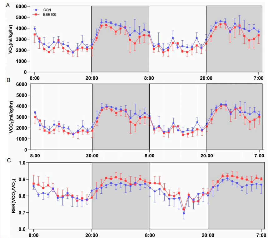 CLAMS系统显示,干预组的 耗氧量 (VO2) 和 二氧化碳产生量 (VCO2) 显著增加。结 合QMR数据可知,这种能耗提升并非源于体型变大,而是源于单位肌肉组织代谢活性的 增强。