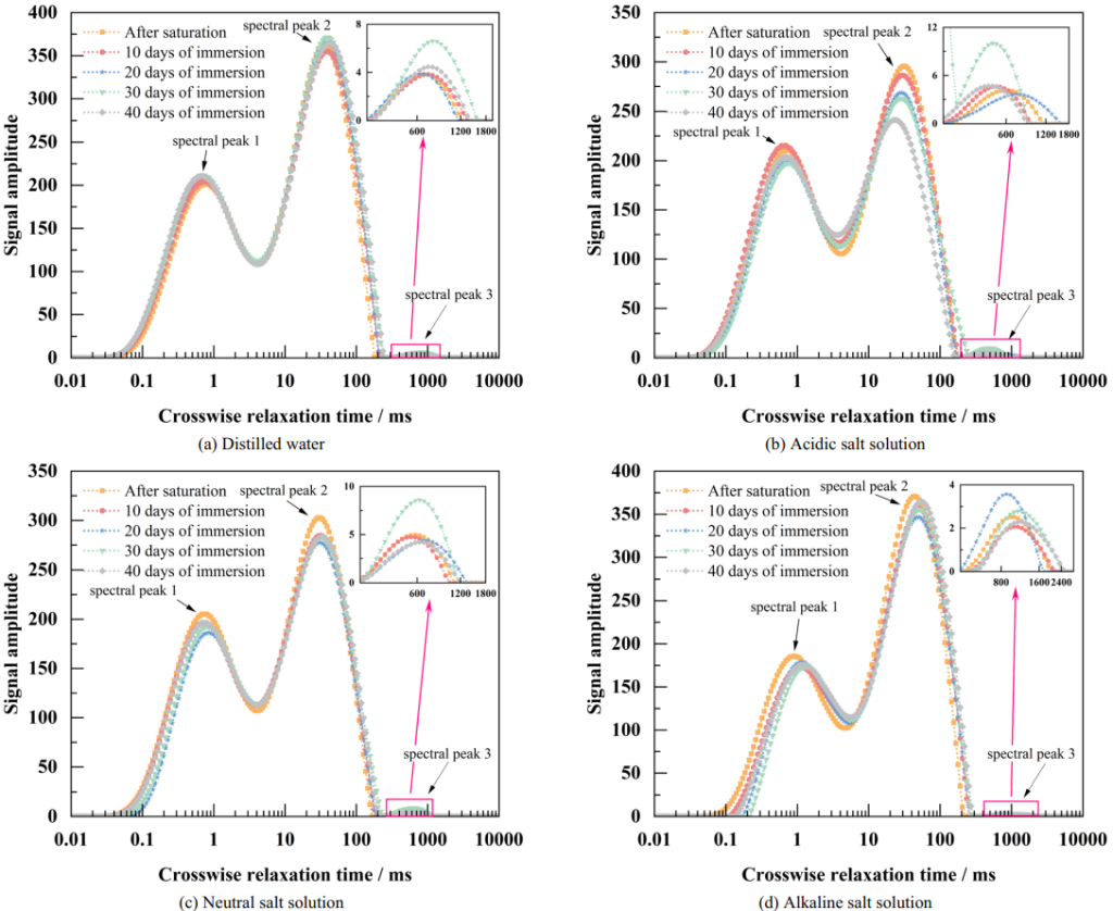 图2展示了不同溶液浸泡时间下红砂岩的T2谱分布变化,反映了孔隙结构的动态变化。根据相关研究,T2弛豫时间与孔隙半径密切相关,通过T2谱分析可推断孔隙大小和分布。具体而言: