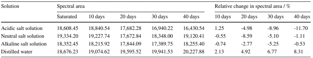 图2显示了红砂岩在四种不同溶液中浸泡40天后的NMR横向弛豫时间T2分布曲线,而表2则展示了与T2分布曲线对应的NMR谱面积的变化。
