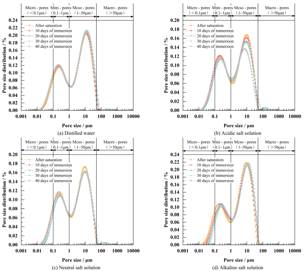 根据图3红砂岩在不同溶液浸泡时间下孔径分布的变化,不同溶液有以下影响: