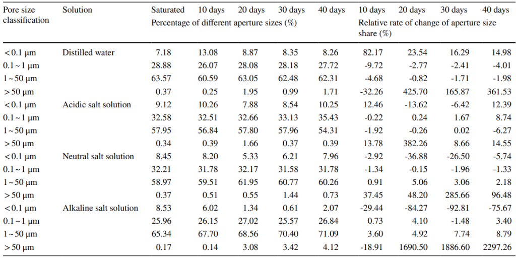 1)孔隙分布变化:在酸性盐溶液中,微孔和小孔的百分比显著增加(如从0天的41.70%增加至40天的45.68%),而中孔和大孔减少。这表明酸性环境促进了矿物溶解和孔隙扩展。