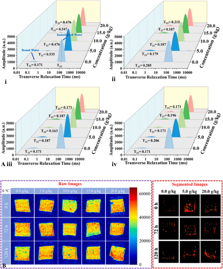 图1. 不同SCPs添加量的鱼丸在冻藏前后水分状态与分布的动态变化: (A) 不同SCPs添加量鱼丸的T2弛豫谱;(B) 鱼丸在0°C冻藏不同时间后的MRI图像及其阈值分割图像(红色信号区域代表高水分含量)。