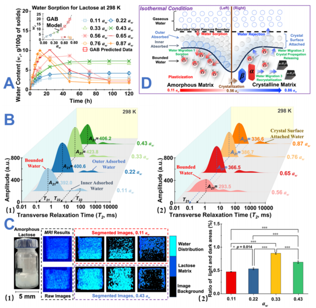 图1. 无定形乳糖在水分活度aw = 0.11− 0.87及298K条件下的吸水行为与迁移动力学的综合研究。