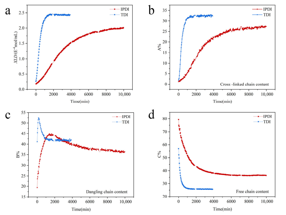 核心规律:交联链含量的演化速率与固化剂的 – NCO 基团反应活性正相关,TDI 的高反应性使其快速形成大量交联链,而 IPDI 的空间位阻延缓了交联链的生成。