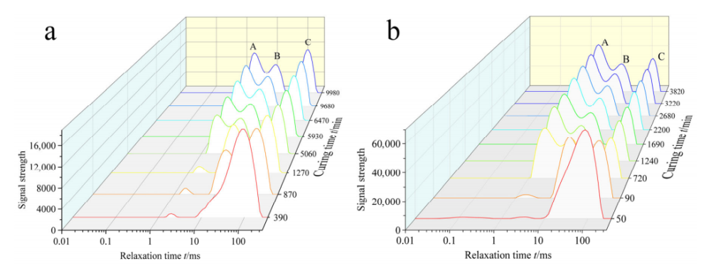 图2:两种 HTPB 推进剂浆料固化过程中的横向弛豫时间(T₂)分布,a(HTPB/IPDI 体系)、b(HTPB/TDI 体系)