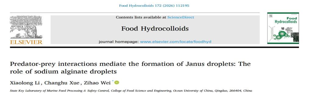 Li X, Xue C, Wei Z. Predator-prey interactions mediate the formation of Janus droplets: The role of sodium alginate droplets [J]. Food Hydrocolloids, 2026, 172: 112195.1.