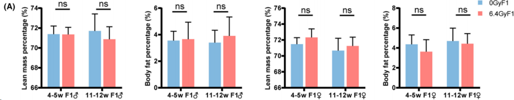 图表中清晰展示了 Fat Mass (脂肪量) 和 Lean Mass (瘦肉量) 随周龄增长的动态变化。 对照组 vs 照射组: 通过QMR的精准定量,研究发现两组后代在成年期的体成分无显著差 异。
