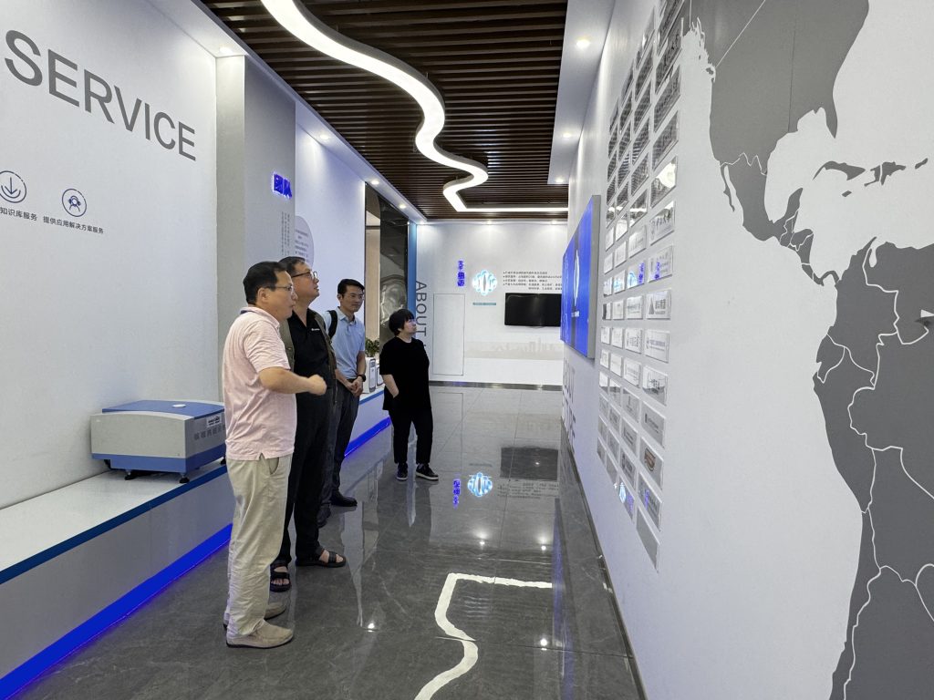 在万象城平台分析董事长杨培强、总经理李向红等人的陪同下,江雷院士先后参观了公司历程展厅、设备展厅、客户体验中心及产品生产线,全面了解了万象城平台在技术研发、产品制造与应用服务等方面的综合实力。杨培强董事长系统介绍了万象城平台二十多年来坚持“政产学研用教”一体化的发展路径,围绕客户实际应用场景,专注低场核磁共振技术的持续创新与仪器制造,实现了从无到有、从有到好、从好到精的跨越发展,逐步打破国外技术垄断,在石油能源、岩土工程、食品农业、材料科学、生命科学等多个领域形成系统化的仪器产品与创新解决方案。
